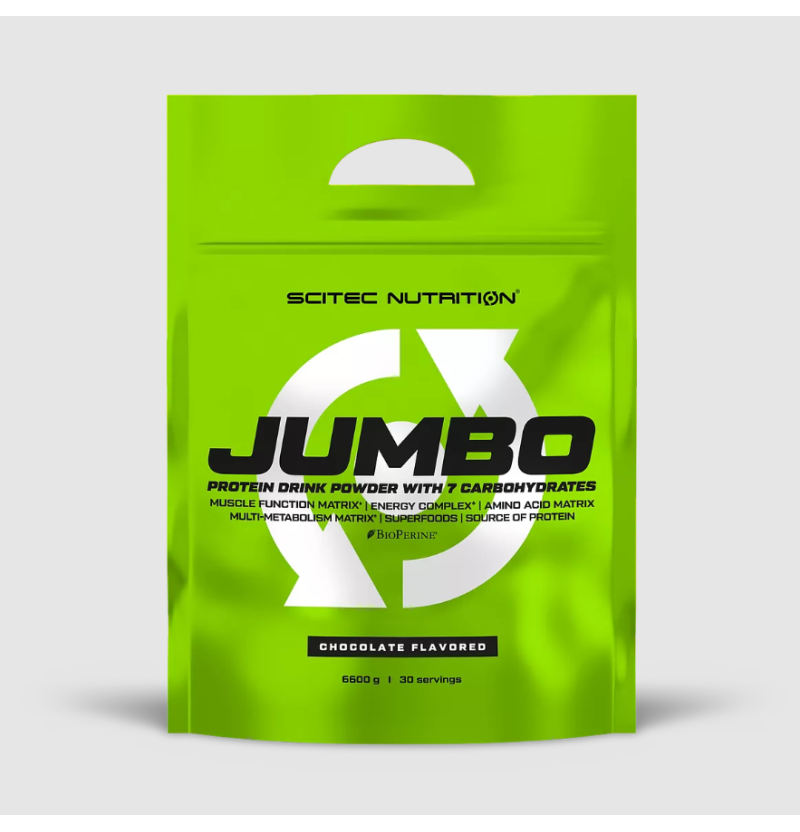 Jumbo, fiel a su nombre, ayuda a aquellos que buscan ganar volumen para lograr ese excedente de calorías más fácilmente. Contiene 53 gramos de proteínas y 140 gramos de hidratos de carbono por ración, enriquecidos con 3 gramos de creatina*, aminoácidos, vitaminas y extractos de plantas.