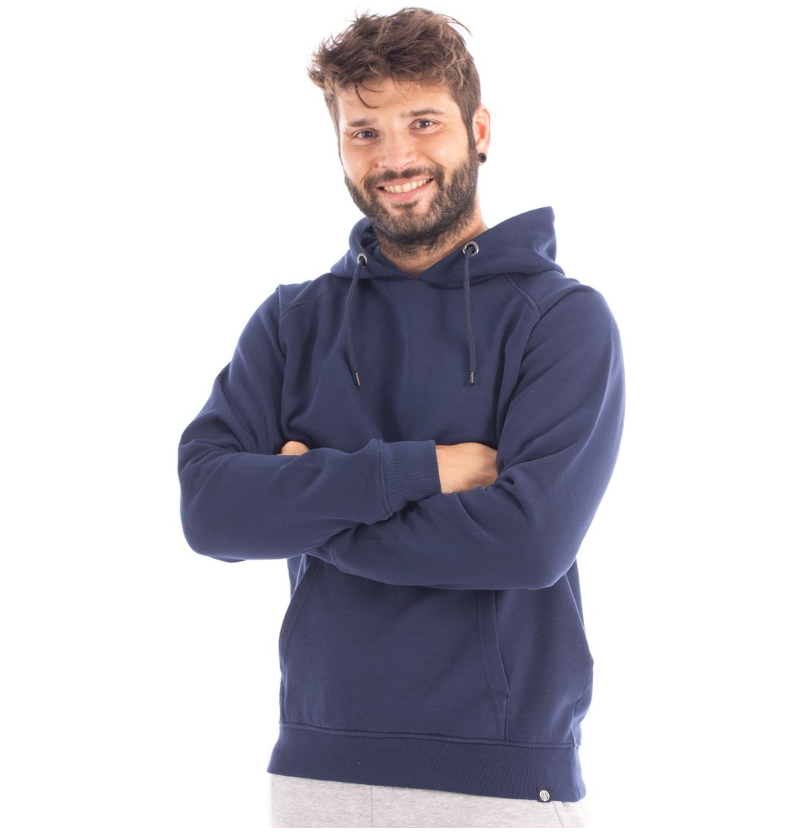 Sudadera básica con capucha ajustable y bolsillo tipo canguro. Composición: 80 % algodón - 20 % poliéster.
