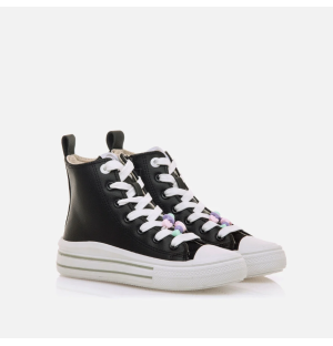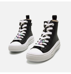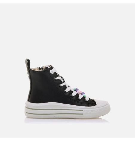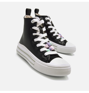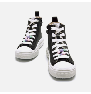 Zapatillas blancas tipo botín de caña alta para niña, modelo Bigger Z de Mustang. Estas zapatillas efecto piel cuentan con cierre de cordones y decoraciones de cuentas en tonos pastel. Destacan por su diseño moderno y divertido, ideal para complementar cualquier look casual. La doble suela con líneas en contraste y los detalles coloridos añaden un toque único. Ofrecen comodidad, resistencia y un estilo encantador que las hace ideales para las pequeñas más creativas. Con certificado VEGANO sellado por INESCOP, el cual garantiza que la naturaleza química principal del material no se corresponde con fibras de origen animal.