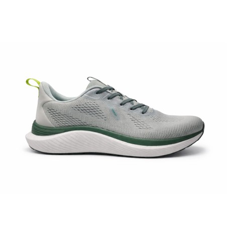 Su parte superior en malla técnica de color verde suave favorece la ventilación del pie, manteniéndolo fresco incluso en los momentos de mayor actividad. El diseño se completa con detalles en verde más intenso y una mediasuela blanca de gran volumen que aporta una excelente amortiguación y una pisada más cómoda y estable.