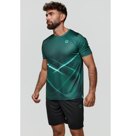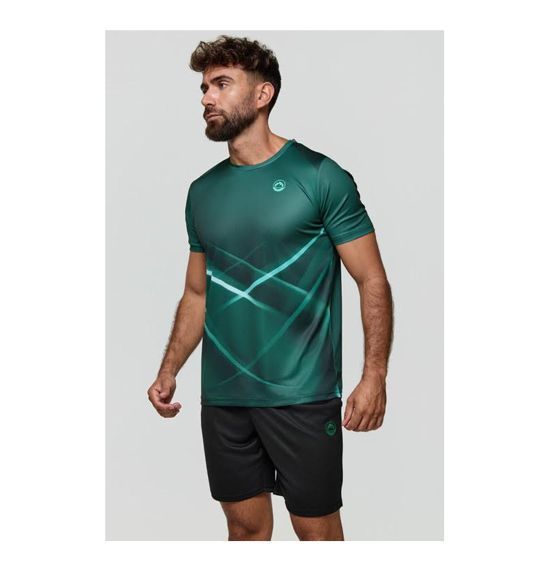 La camiseta presenta un diseño en verde intenso con un sutil patrón geométrico degradado que aporta dinamismo visual sin recargar la prenda. Su tejido técnico ligero y transpirable favorece la ventilación y la rápida evacuación del sudor, manteniendo la piel fresca incluso en sesiones exigentes. El corte es ergonómico y ligeramente ajustado, adaptándose al cuerpo para ofrecer libertad de movimiento y un look atlético actual.